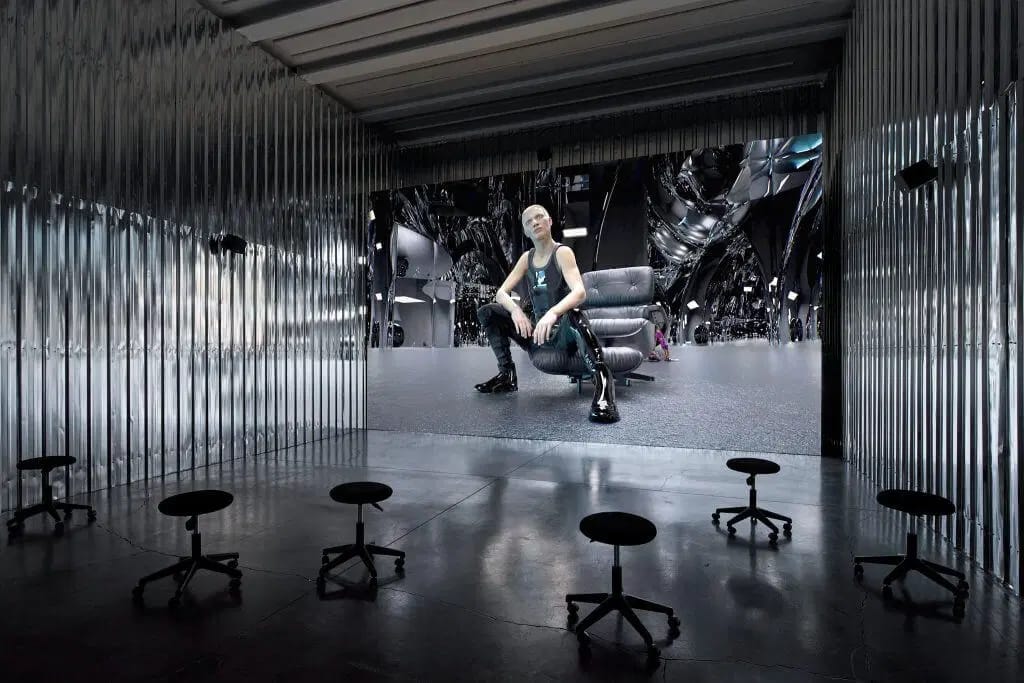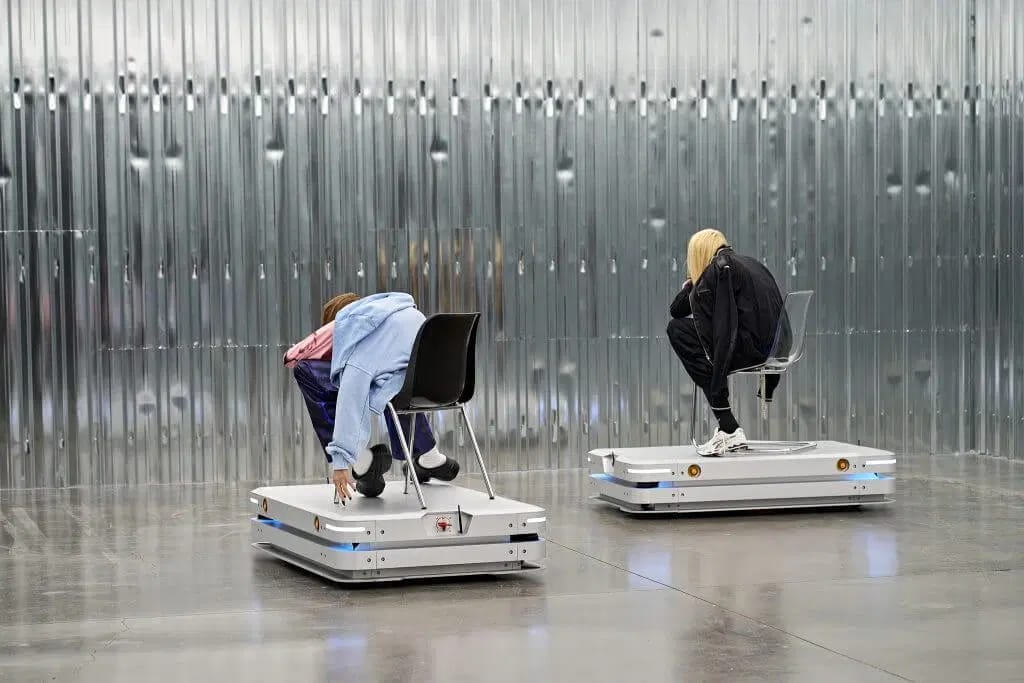 :mentalKLINIK MICA, 2025 (PROFILE SERIES) SOFTCORE RADICAL, BACKROOM BABY, SELF-BANNED, AUTO-GLAM, POLITELY PARANOID, LOW-EFFORT ICON, HYPER EMPATH, SHAMELESS AI-generated sculpture, mannequin, artificial hair, silicone, clothes, shoes, chair, autonomous mobile robots (140.6 x 90 x 29.5 mm), sound, 91 x 93 x 114 cm Courtesy of PİLEVNELİ